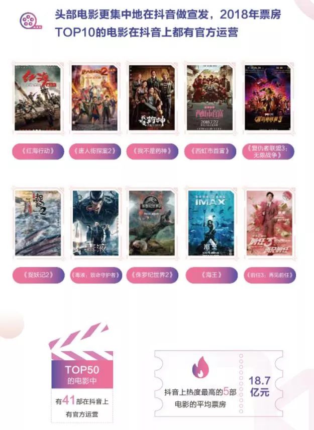 通过总结《2018年抖音电影白皮书》里的数据可以看出,这一年间,票房TOP 50的电影中,有41部在抖音上有官方运营。而剧集方面,今年拥挤的暑期档里《小欢喜》《全职高手》《陈情令》等剧几乎全部都选择了入驻抖音或快手等平台。