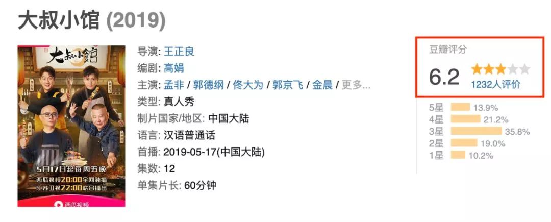 而如果将目光放得更长远一些,借由cut内容和宣发与上游建立起联系,或许能为短视频平台深入内容领域搭起一座桥梁。在此之前,包括西瓜视频在内,很多短视频平台都表露出了想要进军自制内容的想法,并开始了相关布局。前有西瓜视频宣布投入40亿,通过打造移动原生内容IP弥补在长视频上的短板;后有快手在两个月被媒体报道称,正在小范围内测试10分钟以内的长视频功能;今年8月抖音又官宣将逐步开放15分钟的视频发布能力。支颖对外宣称,“开放短视频时长是为了更好地为优质创作者提供扶持和帮助。”但不可否认的是,短视频平台通过对视频时长的延长其实也是一种对长视频的接壤。形式上的跨越容易,质量和运作能力上的跟进却并不简单。比如此前西瓜视频一直在尝试微综艺的可能性,但至今为止还未出现一部占据主流地位或者成功破圈的头部综艺。其2019年主推的综艺《大叔小馆》目前也只有1232人给出了豆瓣评分6.2的成绩,口碑、热度都不算十分理想。