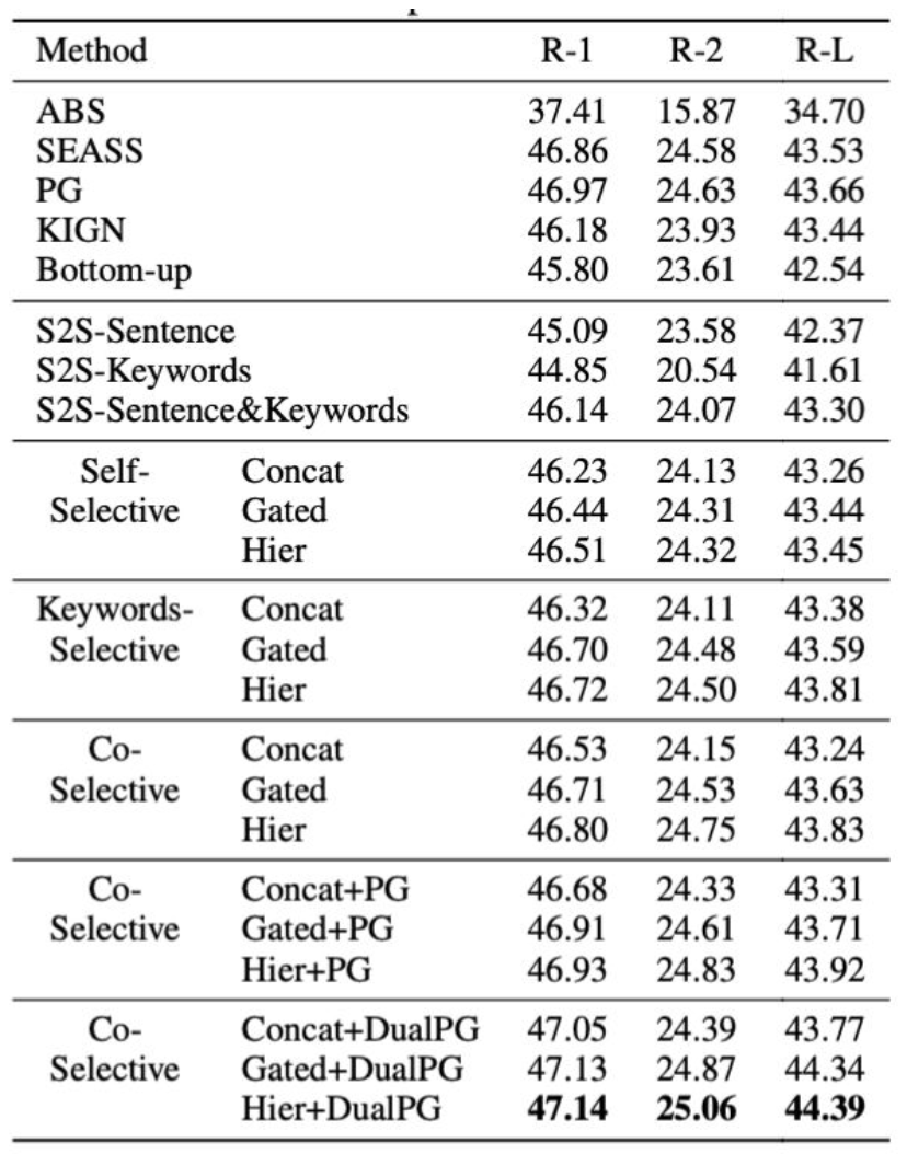 表 1 显示了我们提出的模型比没有关键词指导的模型表现更好。我们测试了不同的选择性编码机制,分别是输入文本的自选择,关键词选择和互选择,实验结果显示互选择的效果最佳;对于 Generator 模块,我们发现层次化融合的方式要优于其他两种融合方式;我们的双向 Pointer 模块比原始的仅能从输入文本中复制的模型表现更好。