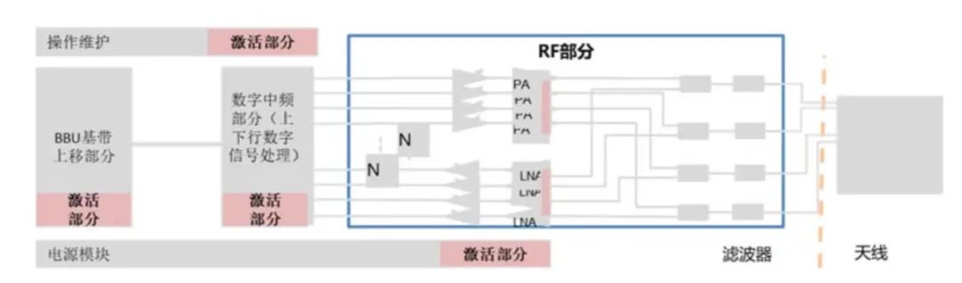 深度休眠:基站关闭AAU功放、绝大部分射频以及数字通路,仅保留最基本的数字接口电路,使AAU进入深度休眠状态以达到降低功耗的目的。