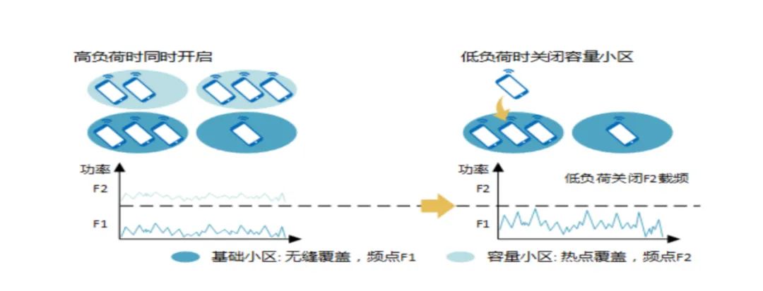 载波关断:在多层频点小区同覆盖场景下,当小区负荷低,可考虑关闭其中一个载波,降低功耗。