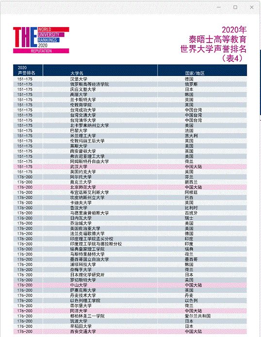 首次列出世界声誉最高的前200位大学,前几年的排名只列出前100位