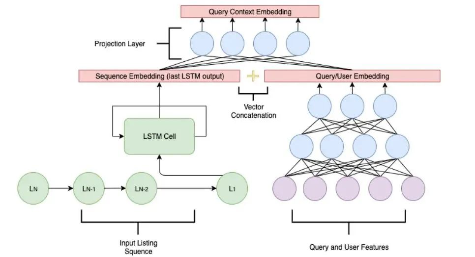 对于listing L, query Q, user U, 首先使用精排排序模型打分,生成top T结果;然后选取精排的top N结果输入到LSTM中,得到Query Context Embedding;接着用重排序DNN模型H,基于Query Context Embedding对精排的top K个listing打分,生成重排结果。重排序模型H的结构,是基于RNN+Two Tower模型 [7]。首先,作者基于下面的网络,计算Query Context Embedding: 左下方的LSTM,输入精排的top N结果;右下方的DNN,输入user和query特征;然后将LSTM的最后输出和query/user侧DNN输出拼接后,经过投影层变换,输出为Query Context Embedding,用来表示理想的listing embedding。然后,作者用下面的网络结构对listing进行重排序打分。