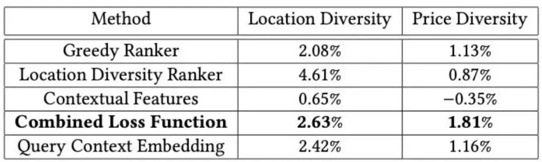 论文里给出了重排序模块,对搜索结果位置、价格多样性优化的效果。具体效果如下:
