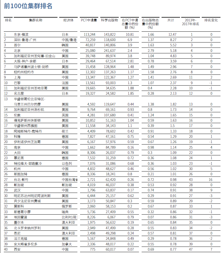 《2020年全球创新指数》中文版显示,科技集群的排名依据包括:《专利合作条约》(PCT)专利申请中所列的发明人,时间跨度是2014年至2018年;科学引文索引扩展版网站(SCIE)公布的科学出版物中列出的作者,时间跨度也是2014年至2018年;发明人和作者地址的地理编码,并使用具有噪声、基于密度的空间聚类应用算法,计算经过地理编码的发明人和作者的点。