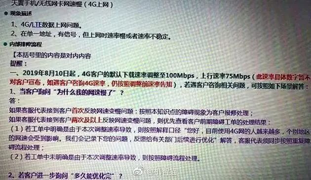 大概意思就是运营商为了迫使用户们换用 5G,给 4G 网络限了速,有人甚至还扒出一份「 内部培训资料 」。