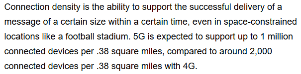 而按照 3GPP 的说法,4G+ 网络的连接数密度只有大约 2000 台设备 / 平方公里。