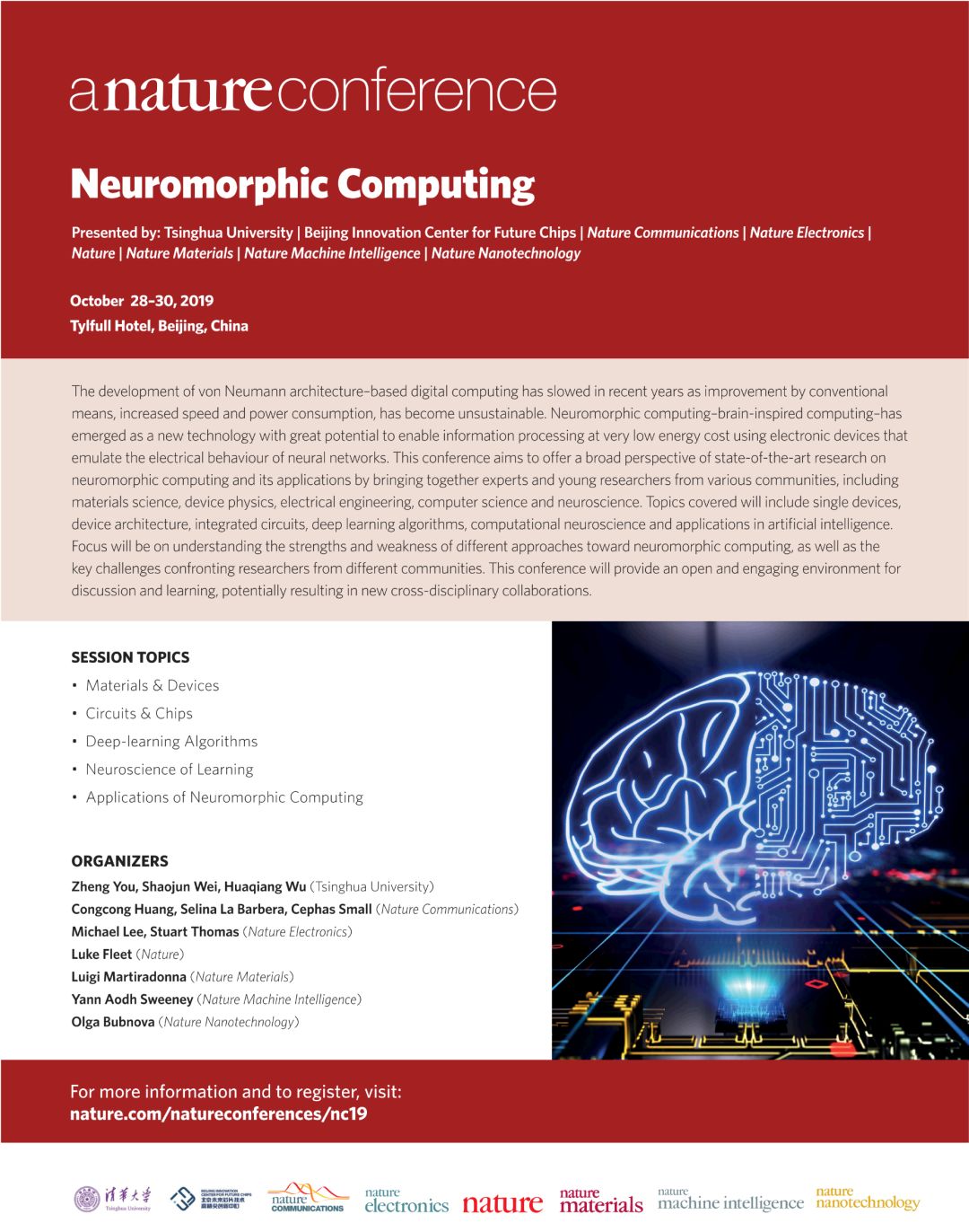 清华大学北京未来芯片技术高精尖创新中心携手世界顶级学术期刊《自然》杂志为大家带来一场以“Neuromorphic Computing”为主题的学术盛会。本届大会将吸引超过30位国内外著名学者、来自Nature、Nature Communications、Nature Electronics、Nature Materials、Nature Machine Intelligence和Nature Nanotechnology的10位重量级编辑以及众多国内外集成电路领域的优秀学者汇集于此,致力于为每一位参会成员提供开放的交流平台与跨学科合作机会!