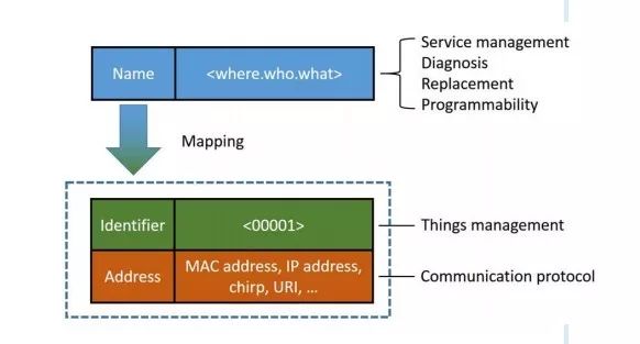 2、命名:命名方案对于编程、寻址、事物识别和数据通信非常重要,但是在边缘计算中还没有行之有效的数据处理方式。边缘计算中事物的通信是多样的,可以依靠wifi、蓝牙等通信技术,因此,仅仅依靠tcp/ip协议栈并不能满足这些异构的事物之间进行通信。边缘计算的命名方案需要处理事物的移动性,动态的网络拓扑结构,隐私和安全保护等问题。传统的命名机制如DNS(域名解析服务)、URI(统一资源标志符)都不能很好的解决动态的边缘网络的命名问题。目前正在提出的NDN(命名分发网络)解决此类问题也有一定的局限性。在一个相对较小的网络环境中,我们提出一种解决方案,如下图所示,我们描述一个事物的时间、地点以及正在做的事情,这种统一的命名机制使得管理变得非常容易。当然,当环境上升到城市的高度的时候,这种命名机制可能就不是很合适了。