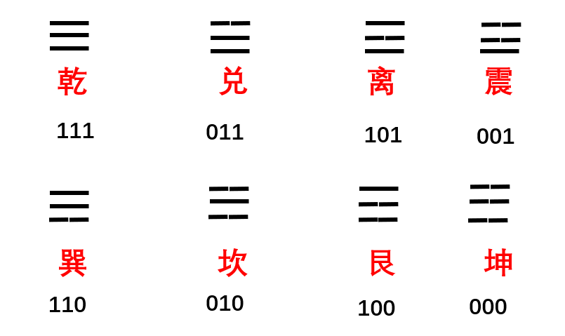 下面我们把八卦阵拉平,并写成二进制。