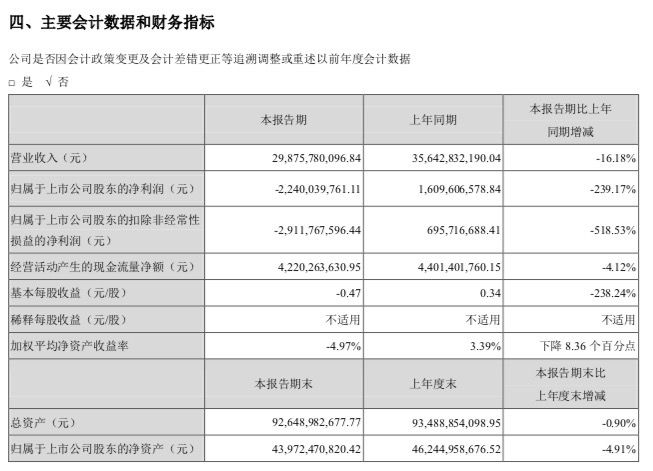 8月30日发布的半年报数据显示,长安汽车2019年上半年营收298.76亿元,同比下降16.18%;净利润-22.40亿元,同比暴跌239.17%;扣非净利润-29.12亿元,同比下滑518.53%。