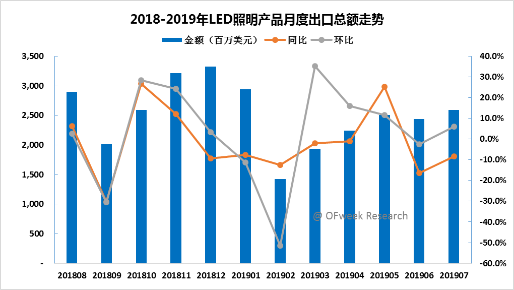 2019年7月是美国对中国第二轮加征关税生效的第三个月,本月中国LED照明产品出口总金额为25.88亿美元,同比下滑8.4%,环比增长6.0%。2019年累计出口金额总共为158.1亿美元,同比下滑4.5%,主要由于LED照明市场需求相对低迷,整体出口增长乏力,替换市场已近高峰。