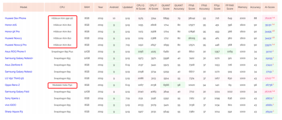 而从AI Benchmark最新测试数据显示,搭载华为kirin 990 5G的开发机型,以76206分位于榜首位置,而排在第二的,也是华为旗下的Kirin 810,然而它的分数只有35130 。很有意思的是,在这个榜单前二十名中,几乎都是华为和高通的芯片刷榜,中间只有一个MTK的P90。