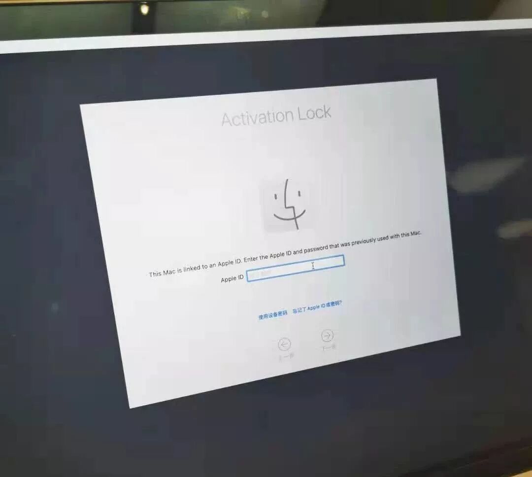 在经过格式化硬盘,重启,Option+Command+R 一顿操作后,出现的不是 MacOS 实用工具,而是一个 Activation Lock 的界面,界面上用英文写道: