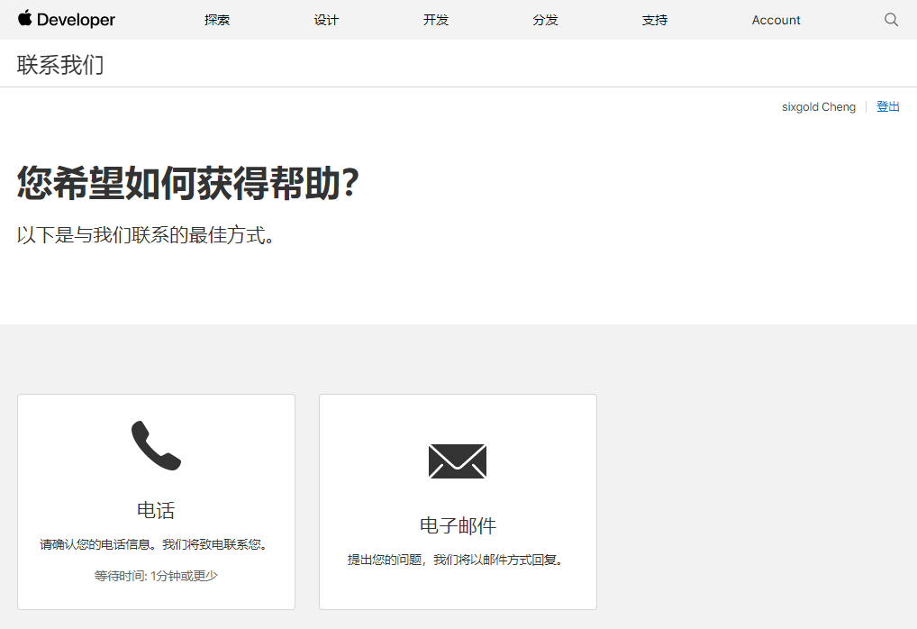 后面我又了解到,苹果的开发者部门是没有任何电话联系方式的,所有问题都需要登记后等待开发者顾问联系你或者通过邮件解决。我这种明天就要出国际差的人怕是等不起这天了。