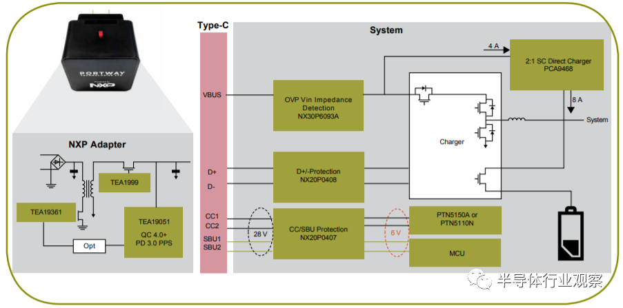当然别人家的孩子的成绩也不是一天提高的,自2013年高通推出QC快充 (Quick Charge)之后,安卓快充技术的发展便驶上了一条快车道,各类技术和标准层出不穷,手机的充电时间不断刷新极限。在搞清快充之前我们首先要知道电池是怎么充电的。锂电池充电一般经过预充电、恒流充电和恒压充电3个阶段。在预充电阶段电池电压低、活性差、内阻较大,只能接受较小的充电电流;随着电池电压的上升,电池活性变强,内阻变小,可以接受较大的充电电流(电池容量的70%基本上都是在恒流阶段充得的);当电池电压上升至截止电压附近时,系统电压便不再上升,充电电流自动减少,直至电池充满。手机用检测到的电池电压来显示剩余电量,如电池电压为4.4V时表示电量为100%,电压为3.6V时表示电量为0%,手机自动关机。充电时间=电池容量/充电电流*系数,缩短充电时间最直接的方法就是增加恒流充电电流。想要提高电流,充电头的输出功率(手机的输入功率)就要提高。所以近年来手机充电头的输出功率从5W、10W、18W一路提升至,VIVO更是在9012年发布了120W快充技术。功率P=U*I,提高功率要么提高电压,要么提高电流,要么两者同时提高。业界因此先后演化出了高压快充、低压快充、电荷泵快充三种方案。2013年高通发布QC1.0,将充电功率率先提升至9W(5V/1.8A),转年推出进阶版QC2.0,进一步提升充电功率至18W(9V/2A或12V/1.5A),从此奠定了自己在高压快充领域领导者的地位。高通选择高压快充方案其实是有原因的。在2014年前后,那时安卓手机的主流充电接口还是MicroB,而MicroB支持的最大充电电流为2A。作为一家第三方供应商,高通在MicroB接口基础上要继续提高充电功率就只有提高充电电压这一条路。另外,高压快充方案实现起来相对容易,成本提升不明显,不用更换接口及充电线,终端客户较容易接受,符合高通作为“平台”的定位。但高压快充方案存在一个严重的问题——发热。充电头输出的9V/12V电压进入手机后会被手机中的充电IC进行二次降压。在降低电压提高电流的过程中,传统BUCK类充电IC的转换效率只有89%,能量的损耗会带来严重的发热(18W快充仅在充电IC上就会有1.96W的热损),且这种现象会随着充电功率的进一步提高变得更加严重。“充电五分钟,通话两小时”,2014年OPPO推出了VOOC闪充22.5W(5V/4.5A)低压快充技术。由于低压快充直接提高了充电电流,不需要进行电压的二次转换,因此很好的解决了高压快充发热的问题,也使得“边充边玩”成为了可能。为了解决MicroB接口无法承接大电流、传统线材寄生电阻过大等的问题,OPPO专门为VOOC闪充定制了充电接口、充电线及充电头。作为一家手机厂商,OPPO可以自由定义自家手机的配置,且不用考虑兼容性的问题。这也是OPPO有别于高通,推出低压快充方案的主要原因。虽然低压快充很好的解决了高压快充二次降压带来的发热问题,但在继续提升充电功率这条路上低压快充也面临诸多挑战,不断提高的电流对流经的各类元器件都是一种考验,线材和接口的热损会变大,整个系统的功耗也会成倍增加,相应的定制成本也越来越高。继续提高充电功率,高电压和高电流看来都是必须的,而高电压和高电流所面临的共同敌人就是发热,发热的一个主要原因就在于充电IC的热损,TI曾经做过计算,同样的热损下,效率增加2.5%,充电电流可以提升27%。因此提高充电IC效率就成为了快充进一步发展的关键。电荷泵是一种无感式DC-DC转换器,他利用电容作为储能元件进行电压变换,可以使电压减半同时使电流增倍。且其转换效率可达到97%左右,远高于普通充电IC的89%。这使得电荷泵在60W充电时的热损比普通充电IC 18W充电时的热损还要低,如此低的发热解决了高压快充的瓶颈,使得超高功率快充成为了可能。另外,标准的Type-C接口支持3A的电流,而在USB PD协议下可支持最高达100W的充电功率(20V/5A),Type-C接口的大规模普及也提高了电荷泵快充的兼容性。基于电荷泵技术,魅族在2017年MWC发布了Super mCharge 55W快充概念机一战成名,TI随即推出了BQ25970这颗量产版的电荷泵。原本在40W快充上计划使用5V/8A的华为,果断在2018年换为10V/4A电荷泵方案,并在Mate20pro上应用。(而魅族至今由于各种原因仍未量产55W快充,其最新旗舰16s pro只配备24W快充。)当然电荷泵也不是万能的,其需要配合传统充电IC与充电头中的协议控制IC一同给手机充电。由于电荷泵一般不具备BUCK类充电IC稳压的功能,因此预充电和最后的恒压充电阶段还是由传统充电IC完成。而在恒流充电和恒压充电初段,需要手机端通过USB PD协议(或私有协议)来协商充电头输出合适的电压配合电荷泵进行恒流恒压充电。当充电头电压调节到电池电压的2倍时,电荷泵就能正常的进行恒流恒压充电。40W电荷泵快充大致充电过程如下图所示。2019年2月,VIVO子品牌IQOO推出了进阶版的44W电荷泵快充,46分钟即可充满4000mAh的电池。为进一步提高电荷泵在大电流下的效率,IQOO采用了两颗BQ25970并联分流的方式,在提高效率的同时减少机身发热。(其实IQOO与Mate20pro充电最大功率均为36W左右,但IQOO的最大功率充电时间较Mate20pro更长,全部充满所需时间更短。IQOO所标称44W更多的是为了表示其与友商相比充电效率更高罢了。)快充方案的核心在于快充芯片,以NXP的电荷泵快充方案为例,核心芯片一般包含手机端的和充电头端两类,具体如下图所示。手机端的芯片可靠性要求