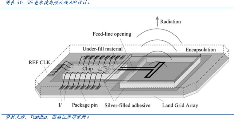 材料的多样性要求先进封装技术,SiP将脱颖而出。随着移动通讯技术的升级,射频芯片采用的工艺也越来越复杂,对PA而言最好的工艺是GaAs,对天线开关而言最好的工艺是SOI,滤波器则是采用压电材料。SOC方案难以集成这些不同材料;系统性封装SiP才能满足这些要求。因而5G时代的射频前端集成化,将采用先进封装技术。根据Yole预测,移动端RF SiP市场规模将由2018年的33亿美金增长到2023年的53亿美金。射频前端的SiP封装将进入一个快速增长期。其中,集成PA、Filter、Swtich的PAMid增长最快,在射频前端模组中的比重从23%增长到39%。AiP(Antennas in Package)即基于将天线与射频前端模块集成在系统级封装中的封装工艺。AiP 技术很好地兼顾了天线性能、成本及体积,我们通过三星S10 5G的拆机可以发现,AiP封装模块已经正式用于5G手机,在基于高通方案的5G手机中,一共采用了三个基于AiP封装的高通QTM052模块,单机封装价值量进一步提升!