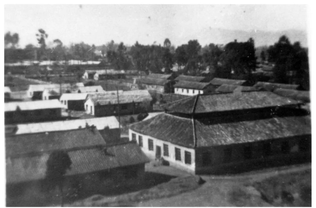 图2 照片右边的一座两层屋顶的大房子是西南联大的最大的建筑,是大图书馆,兼作礼堂。其他是教室和学生宿舍