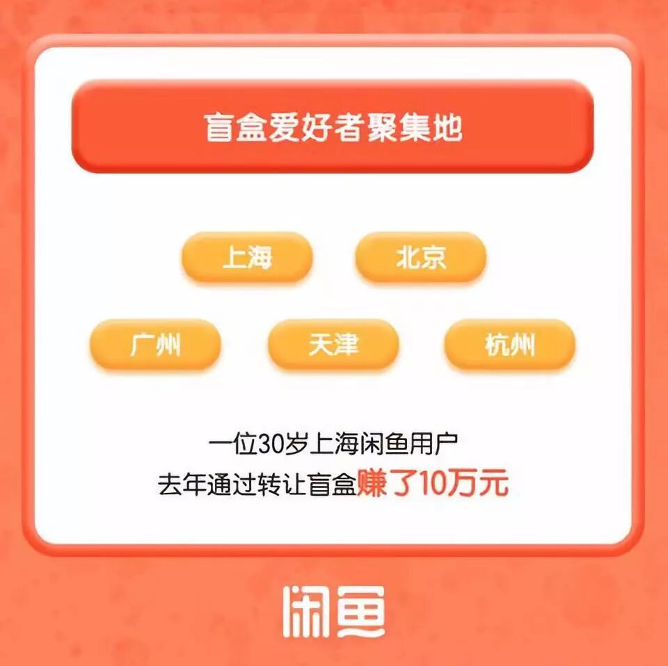 闲鱼报告显示,去年一位 30 岁的闲鱼用户,光是通过转让盲盒就赚了 10 万元,盲盒的价值可见一斑。