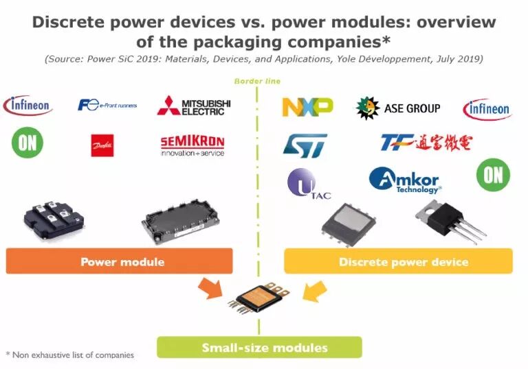 在硅领域,功率模块通常用于高额定功率的应用(如电动汽车主逆变器和轨道交通),分立功率器件则用于低额定功率的应用。如下图所示,一些厂商,如英飞凌,兼顾分立器件和模块;其他厂商,如丹弗斯和赛米控,则是纯模块封装厂商;同时还有一些分立器件封装厂商,其中包括多家封测厂商。