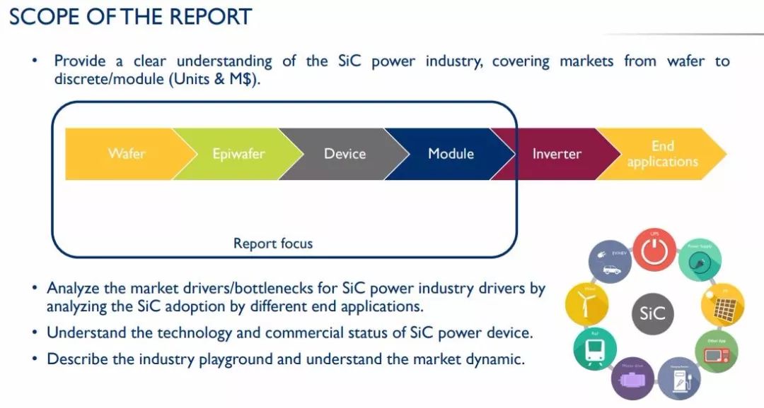本报告概述了SiC器件技术,包括介绍了分立器件和模块开发,以及商业产品的现状和可靠性。报告还全面总结了碳化硅功率器件产业,涵盖整个价值链:从材料到外延到模块。此外,Yole还分析了当前市场动态和未来发展趋势。