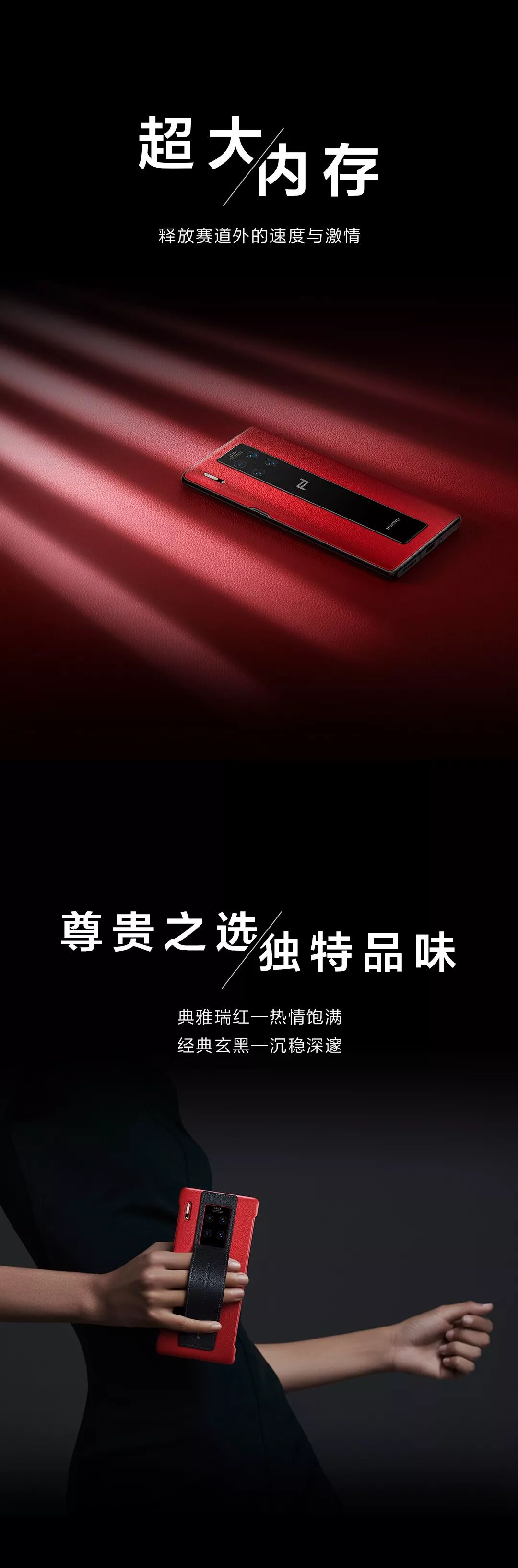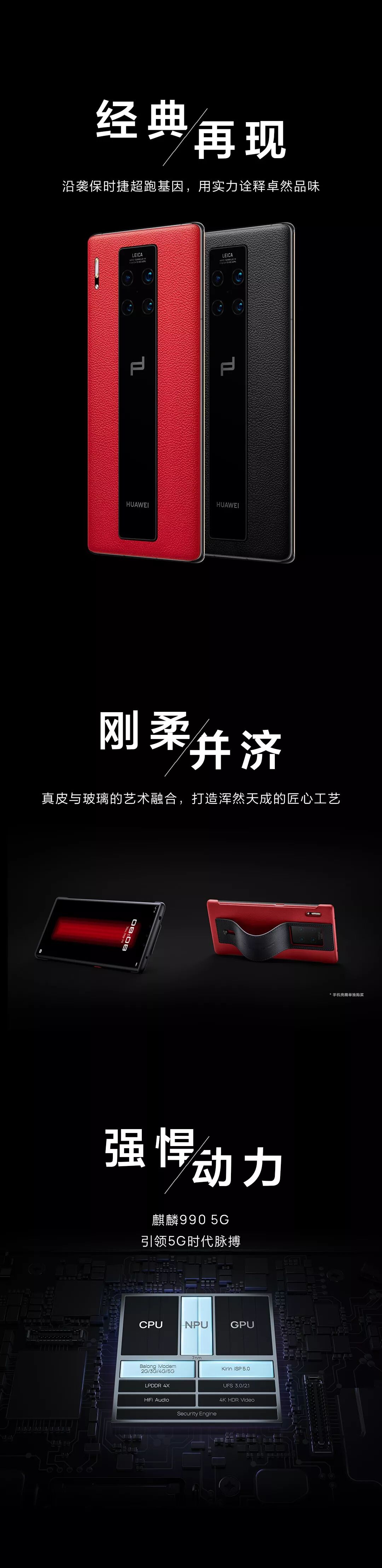2019年的华为Mate30 RS保时捷设计有两种配色,黑色或红色作为主体相互交织,也是皮革与玻璃两种材质的融合,中轴带的灵感来自赛道,与之匹配的手机壳也有一个中轴带,可以展开作为手环。这款手机也采用麒麟990芯片,存储搭载组合为12GB+512GB。