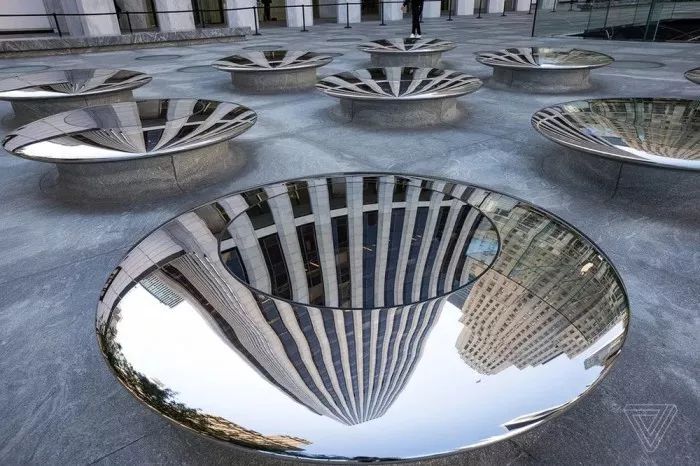 当商店重新开业时,广场地面上的一系列天窗将承担白天照明的大部分重任。每一个圆形的舷窗都将被磨砂,让光线进入的同时保护行人的隐私,并使用银色LED环补充照明。自然采光也将被用来保持八棵树和地下空间的绿色墙壁的活力。在Cube的左侧和右侧,共有18个苹果公司称之为“sky lenses”的金属座椅,恰好提供了鸟瞰商店的视角。