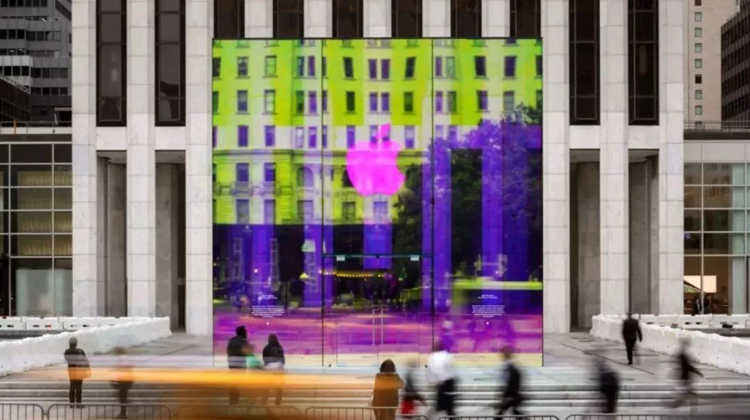 不同于传统苹果店标志性的透明玻璃幕墙与白色装潢风格,新店的玻璃罩上覆盖了一层彩虹色的涂料。它反射出绚烂的颜色,给繁忙的街道增添了一道彩色光环。