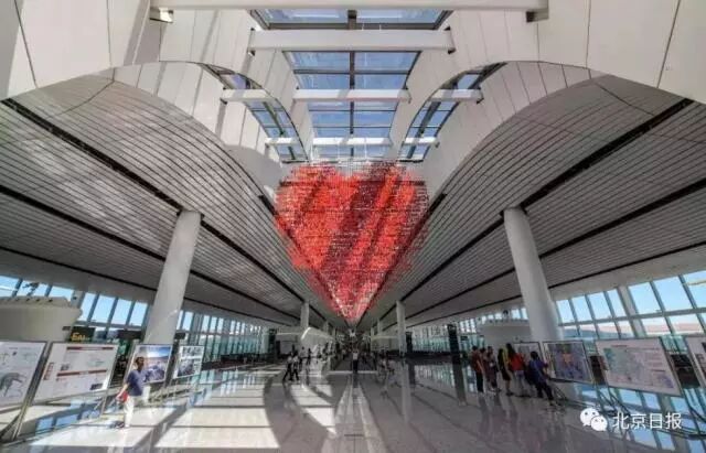 如果搭乘国际航班,出发指廊尽头,一颗多国语言书写的“爱”字组成红色爱心悬挂在了空中,从它的下方穿过,便进入到了中国园的内部。浓浓的园林古风尽收眼底:亭台楼榭、小桥流水、假山凉亭、长廊水榭,让旅客在出国门之前再次领略到中国古建筑的巧妙与智慧。