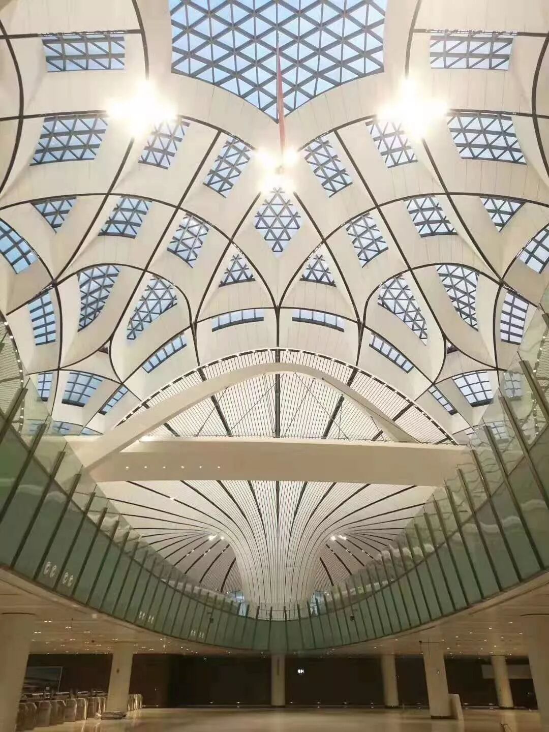 航站楼整座屋顶由一个中央天窗、六条条形天窗和八个气泡窗组成,需要用12800块不同形状和材质的玻璃拼接而成,玻璃接缝胶黏长度可以环绕北京四环路一圈。更不简单的是,看似轻飘飘如云朵一样的屋顶,其实光是网架重量就超过3万吨,相当于大半个鸟巢钢结构的重量。