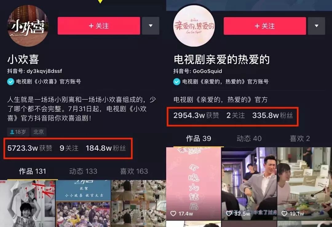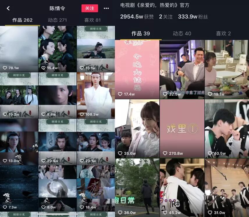 这种几十秒或者几分钟的剧情片段,在行业里更多也被称之为cut和“卡段”,通常指的是一部片子里的戏剧性片段集锦,或者剧集拆条。这些短短几秒钟或者几分钟的内容,由于提取剧集的精华部分,所以常常会给人留下深刻的印象,从而达到推广和宣传效果。尤其是在信息碎片化时代,借助短视频平台等载体,cut成了剧集内容扩散的最好方式之一,在剧集受众中的地位变得越发重要。特别是在今年的暑期档,当国产剧迎来集体爆发的同时,cut剧也来到了一个高峰期:根据微博电视提供的数据显示,《陈情令》的微博相关短视频播放量高达165亿,《亲爱的,热爱的》紧随其中,以122亿的播放量位居第二位。而在抖音里,这两部剧集的cut也同样在刷屏,播出期间也是多次登上热榜第一,关于“陈情令”话题的短视频播放量高达90亿,而“杨紫李现吻戏花絮”这一话题就曾获得高达744.6w的热度指数。而在这些火爆的cut内容背后,除了热情的粉丝外,片方是更为重要的推手。据毒眸统计显示,暑期档爆款《亲爱的,热爱的》在抖音官方账号拥有着335万的粉丝;以教育题材成功出圈的《小欢喜》,聚焦全民关心的教育痛点,在平台上的短视频作品共获得了5723万次点赞。可以预见的是,随着传播渠道多元化和内容传播载体的更迭,cut未来在剧集宣发中所扮演的角色将越发重要,或许会有越来越多的剧集制作公司、宣发公司将精力倾注在cut内容上。而与此同时,毒眸认为,此前一直只是作为载体和工具的短视频平台,也有机会从中找寻到合适的商机,进而开拓包括营销在内的更多B端的生意,甚至助力其去探索产业上游。