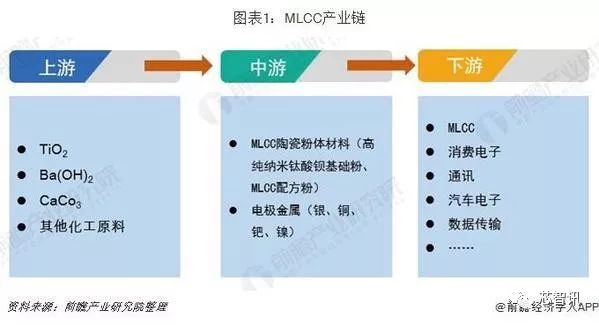 MLCC产业链上游主要是二氧化钛、氢氧化钡等化工原料;中游为MLCC电子陶瓷材料等生产MLCC的主要原料;下游则为终端消费领域,包括消费电子、通讯、汽车等。