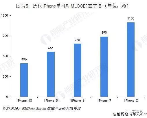 其中,消费电子的创新大幅增加了MLCC的需求。消费电子领域包括一般消费类产品和高端消费类产品,一般消费类包括笔记本电脑、电视、电话、普通手机和数码相机等电子产品;高端消费类包括专业录音录像设备、智能手机等电子产品。以iPhone为例,iPhone4S的单机MLCC需求量仅为496颗,到4G时代的iPhone X已增加至1100颗。