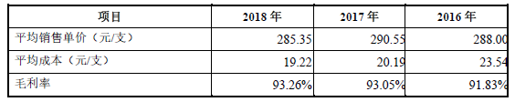 昊海生科还在招股书中披露了玻尿酸产品的平均单价和成本,2018年,该公司一支成本为19.22元的玻尿酸产品,销售单价能达到285.35元,毛利率高达93.26%,堪比茅台。