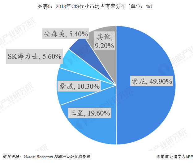 在CIS行业,索尼是当之无愧的龙头霸主。根据台湾地区Yuanta Research发布的数据,2018年索尼以49.90%的市场占有率囊括CIS行业半壁江山,稳坐行业第一;韩国三星的市占率达19.60%,位列第二;中国企业豪威科技(OV)以10.30%排名第三。