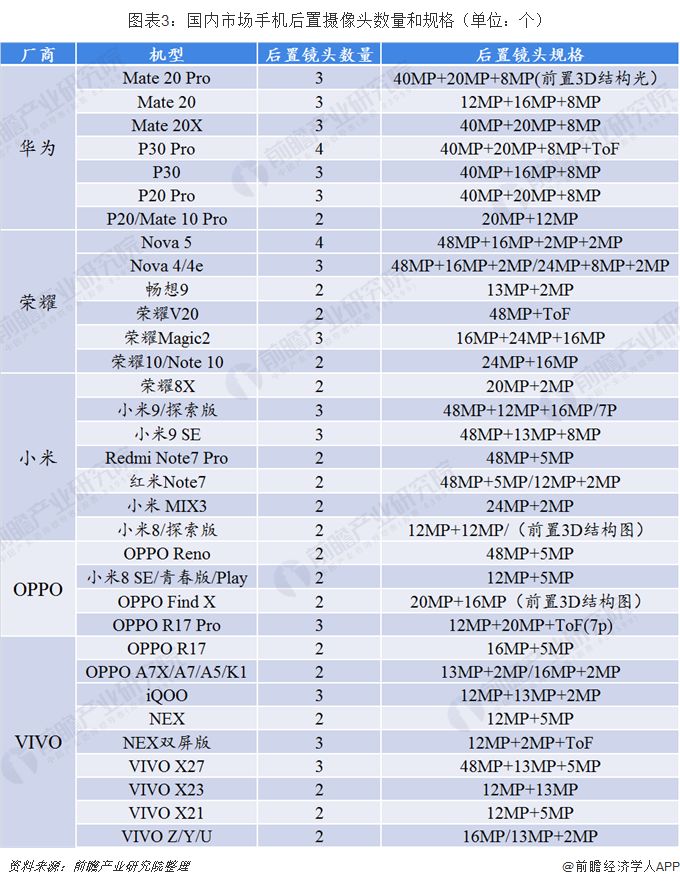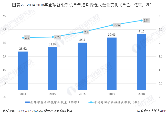 根据相关数据统计,2018年全球智能手机摄像头总数达到41.5亿颗,平均每部手机搭载摄像头颗数达2.84颗。2019年三星A9S、诺基亚9 PureView分别成为第一款搭载四摄和五摄的手机,预计今年单部手机平均摄像头将会突破3颗,三摄市场渗透率迅猛提升。手机摄像头个数增多,逐步推动了“广角”、“长焦”、“微距”和“虚化”等3D成像质量的提升,同时促进双(多)摄视觉解决方案市场规模稳步增长。