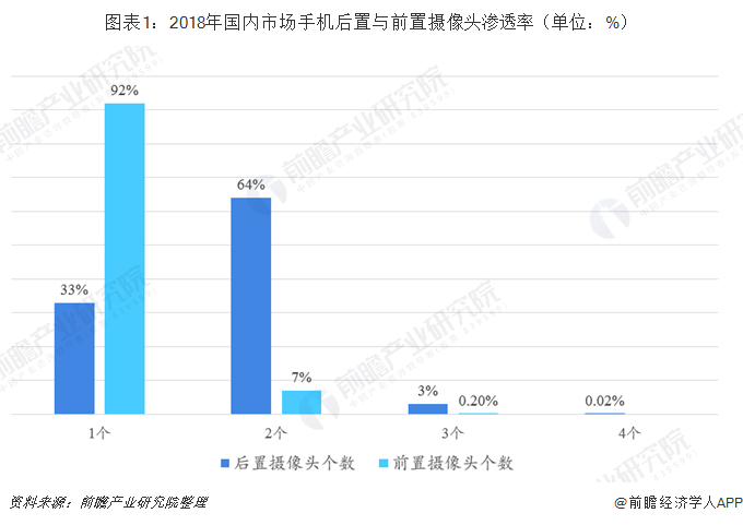 智能手机更新换代迅速,手机摄像头的性能与功能不断升级与创新,手机搭载摄像头数量逐年提升,根据中国信通院统计,2018年全国在售手机中后置双摄占比已达到64%,95%的手机后置摄像头最大像素超过1200万像素。2019年,手机搭配三摄已成为市场主流,四摄五摄机型已经逐步推出。