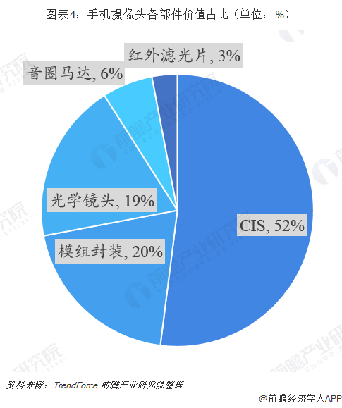 手机摄像头的部件主要包括镜头组(Lens)、红外滤光片(IRCF)、音圈电机(VCM)、CMOS图像传感器(CIS)、模组封装等,其中CIS占据了52%的价值量,是手机摄像头中价值量最高的部件。图像传感器除了CIS外,还有CCD图像传感器。CCD成像质量虽高,但制造工艺复杂,价格昂贵,通常运用于单反相机和摄像机领域;而CIS成像质量尽管不如CCD,但是集成度高(体积小),成本低,广泛应用于手机摄像头、消费电子、安防、汽车、PC等领域。