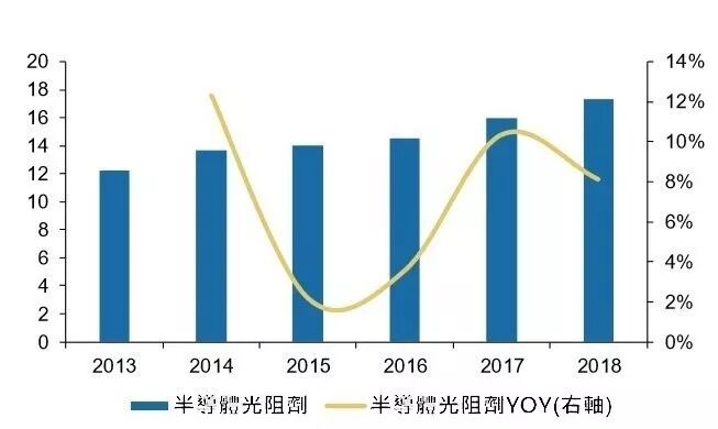 图:全球半导体光阻剂市场规模 (单位: 亿美元)