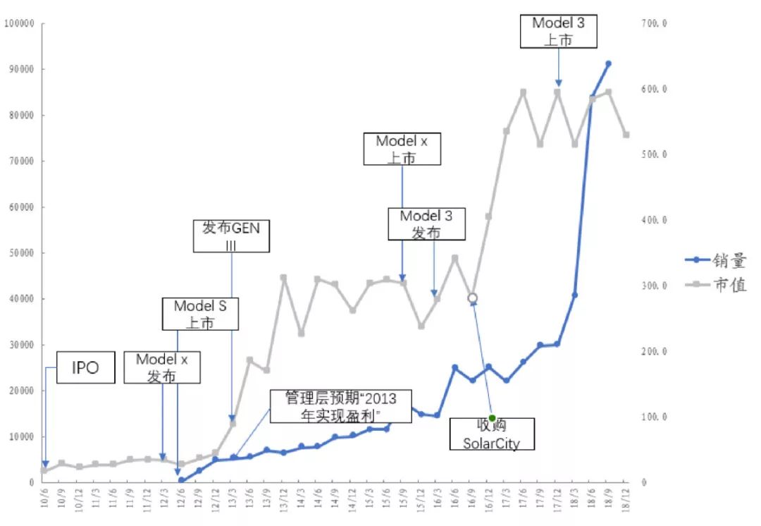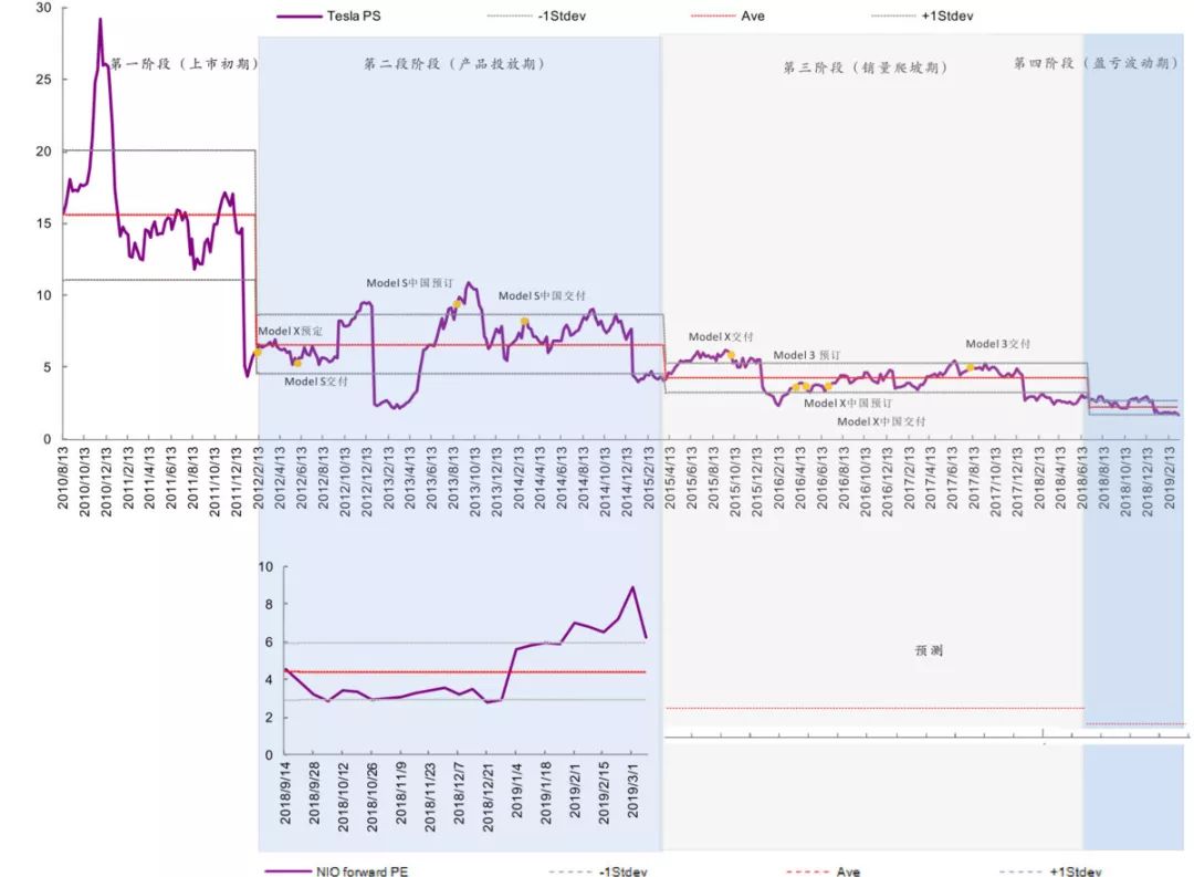 那么如何对蔚来估值?从积极的方面来看,由于电池价格快速下跌(每年约10-15%)和政府主导的充电基础设施推出,中国新能源车市场到2020年复合年增长率将达到50%。蔚来战略性地瞄准了高端电动车市场,2020年之前这个细分市场缺乏竞品。如果蔚来能够使交付量从2018年的1万多辆增长至2020年的10-11万辆,那么这个商业模型就可以持续。但就如本文第一部分所讲的那样,汽车工业的大周期已经发生改变,2014年成立的蔚来不是2003年成立的特斯拉,2020年庞大的传统车企纷纷正式发售量产新能源车,再加上特斯拉Model 3的国产版量产(价格下探),这对尚处于产品投放期还未到产能爬坡期的蔚来来说,将是致命影响。复盘特斯拉,特斯拉在2009-2018年间,共通过股权融资55亿美元,债务融资88.5亿美元,共计143.5亿美元,累计研发投入高达56.7亿美元。据华创证券分析,特斯拉在2012年6月之前,都属于初创期,仅有出售Roadstar和动力总成的少量收入。2010年上市后,在2012年6月至2018年12月迎来高速发展期,Model S、X、3、Y相继上市,并获得巨大成功。直到2018年12月之后,特斯拉的Model 3量产产能爬坡达到6000辆/周,现金流才转正并实现盈利。一些投行使用DCF为特斯拉估值,汽车企业的市值驱动逻辑核心是销量,而销量可以带来收入和利润。华创证券分析,从销量角度看,特斯拉的市值上涨大致分为两个阶段:一是Model S上市后,市值从35亿美元上升至300亿美元。市值增长与销量增长同步,但幅度明显高于销量增长。特斯拉是第一家仅生产纯电动汽车的企业,在Model S成功上市后,市场才开始逐步对电动车行业以及公司的未来盈利建立预期。这一区间内,公司股价上涨了7倍。二是Model 3发布后,订单数量持续超市场预期。特斯拉市值从300亿美元上升至500亿美元。市值的增长幅度低于销量增长。直到2018年之后,特斯拉销量稳定爬坡后,市场开始切换到PE、EV/EBITDA估值。华创证券对蔚来的销量、毛利率做了悲观/中性/乐观三种预测:即2026年销量达到25/38/43 万辆;毛利率分别为18%/20%/21%,基于7年期的DCF模型计算,得到蔚来对应的目标价分别为2.95/6.41/9.72美元/股。从结果来看,目前蔚来市值接近悲观预测。在悲观预期下,ES6销量为3000辆/月,2026年累计销量达到25万辆,毛利率18%,净利润30亿元。在J.P.Morgan的估值中,采用了综合法,结合2023年P/S(市销率)、P/E(市盈率)和EV/EBITDA(企业价值倍数)的预测,各给予三分之一的权重,预测2023年目标价为4.59美元。