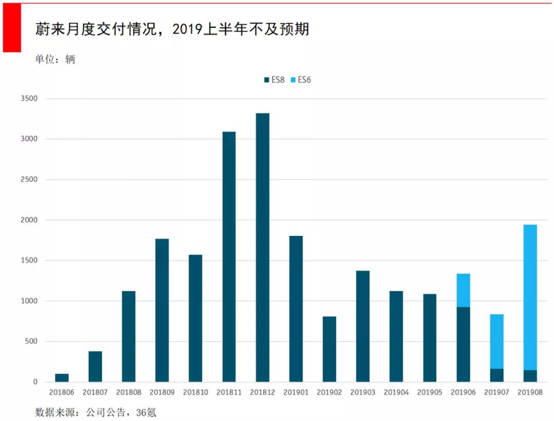 结果显示如果2019年ES8年产量2.2万辆、ES6年产2.3万辆,单车制造成本约29.5万元,对应毛利率13%左右;若能年产10万辆,则毛利率可以突破20%。江淮的代工费约单车8500元左右,如果按照可折算2.64亿元作为江淮工厂的盈亏平衡点,大约需要为蔚来代工31,035辆车。李斌在Q2财报电话会上透露,蔚来汽车业务的毛利率在今年无法转正。Q2汽车毛利率为-4%,由于下半年是相当艰难的时刻,所以Q3预计是-6%,Q4预计会进一步恶化在-6%至-10%之间。但CFO谢东萤也强调,今年下半年不会再出现亏损32亿的情况,Q3、Q4将大力削减成本。蔚来可能无法达成年初定下的全年汽车销售目标。2019年已经过去8个月,蔚来共交付了7439辆ES8和2883辆ES6,李斌在Q2财报电话会上透露,下个季度预计将交付4200-4400辆汽车。即便按最多的4400辆计算,2019年前三季度仅交付了1.9万辆,离蔚来年初定下的目标4-5万辆还差一半。李斌在Q2财报电话会上解释称,由于中国汽车市场持续疲软,乘用车批发销售较上年同期下降14.3%。另外,高档汽车品牌之间开启了激烈的价格战,平均售价与最高水平相比下降了20%至25%,但蔚来在7、8月并未降价,所以ES8的价格实际上提高了10%,这也影响到了蔚来的销量。