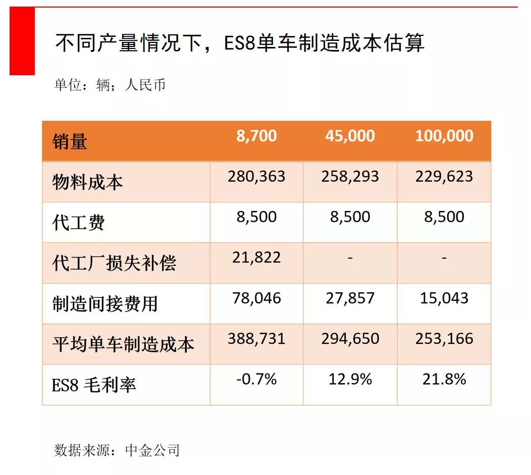 蔚来在2020年之前把账算清楚也十分重要,而不是止不住亏损的脚步。据中金公司测算,由于汽车制造业的规模效应会快速摊薄间接费用、减少代工厂损失,所以针对不同的产量情景做了模拟: