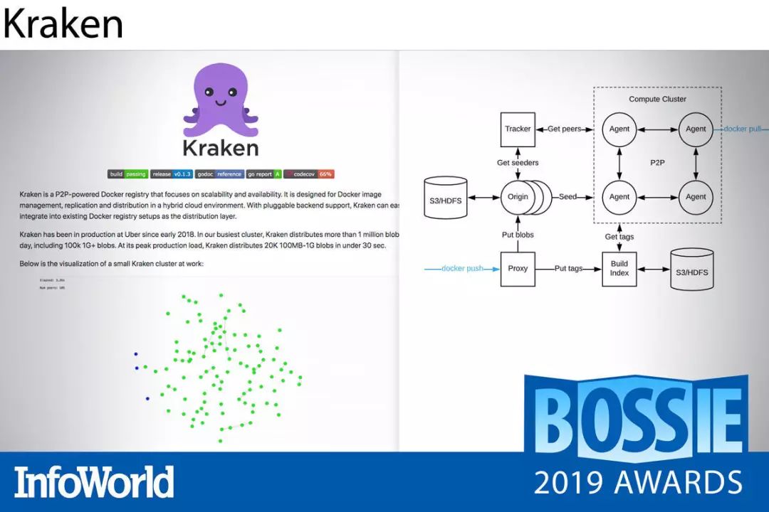 Kraken 是一套面向 Docker 注册表的高可扩展性对等缓存与分发层,能够在几秒钟之内完成 TB 级镜像数据的提取。Kraken 的核心为包含三大主要组件的自我修复型 torrent 种子架构。源种子节点缓存首先从可插拔的后端 Blob 存储(例如 Amazon S3 或者 HDFS)当中提取镜像数据。跟踪器节点随后创建所有可用对等方与发种方的内存全局视图。对等方负责实现 Docker 注册表接口并自主执行镜像 pull 请求。