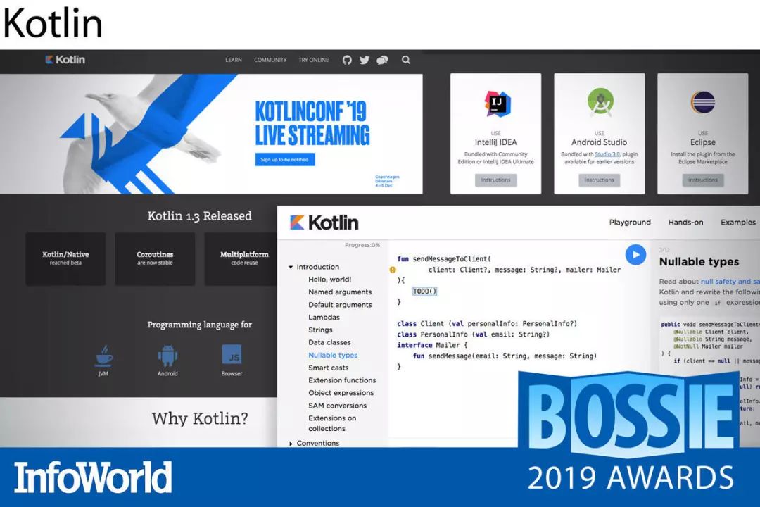 号称为“完美版 Java”的 Kotlin 语言由 JetBrans 公司所创建。该公司还开发出针对 Java 的 IntelliJ ID。Kotlin 语言的 beta 版本最初发布于 2011 年,它能够像 Java 一样在 JVM 上运行,并能够与 Java 库无缝实现互操作。但是,它也消除了 Java 当中的大量冗余细节,增加了强大的函数编程能力,同时以更优雅的方式解决了空指针异常等安全问题。此外,谷歌目前也已经将 Kotlin 指定为创建 Android 应用程序的首选语言,这意味着即使转投 Kotlin 怀抱,各位 Java 开发者也不用担心失去 Android 这一巨大的应用开发市场。