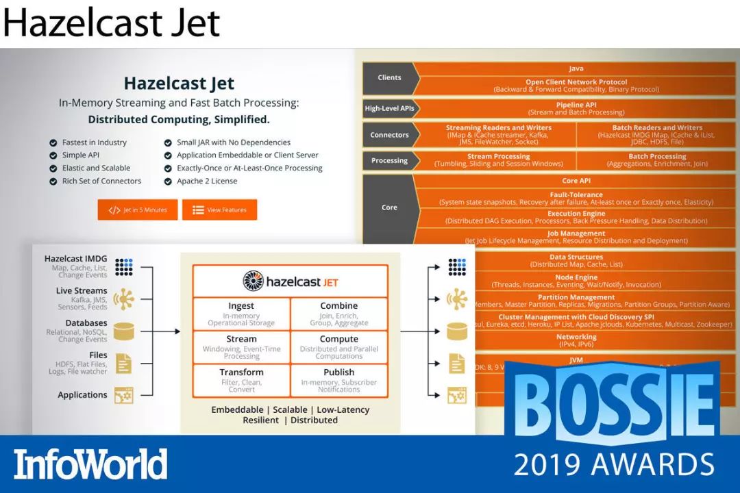 今年,以开源内存数据网格闻名的 Hazelcast 发布了 Hazelcast Jet 的首个通用版本。Hazelcast Jet 是一套 Java 可嵌入分布式流处理引擎。尽管刚刚发布通用版本,但 Hazelcast Jet 3 已经拥有多年的实践应用经验,并用实际表现证明了其强大的可靠性水平。(从 3.x 版本开始,Jet 与 Hazelcast 的旗舰 IMDG 产品版本保持一致。)