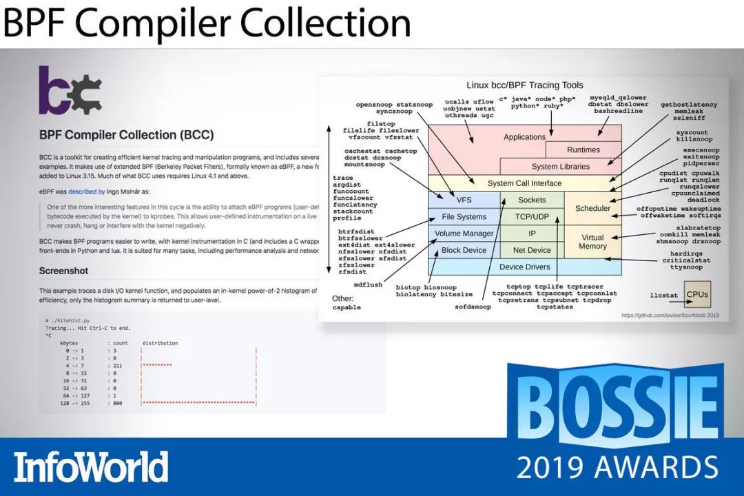 BPF Compiler Collection 以高效观察作为设计的核心目标,这套集合包含由 Python 或 Lua 语言创建并运行的一组 eBPF 代码编译器工具。该项目中还提供大量示例程序,可面向代码内存分配以及 HTTP 数据包等任务运行跟踪及全域筛选。