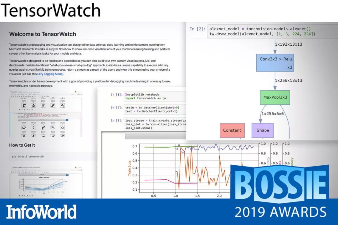 TensorWatch 是一套用于深度学习模型调试与可视化的 Python 库,由微软研究院开发完成。其能够在模型训练的同时,实时显示可视化图形。此外,它还提供强大的训练前与训练后功能,包括模型图可视化、降维数据探索、模型统计以及用于卷积网络的多种预测解释器。