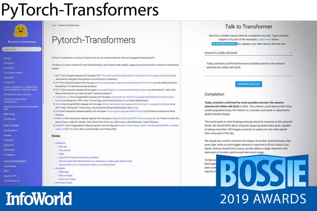Hugging Face 的开发人员们通过 PyTorch-Transformers 为 PyTorch 以及 NLP(自然语言处理)社区做出了巨大的贡献。这套库中包含着大量最新、最前沿的 NLP 研究模型实现成果,例如 BERT、GPT-2 以及 XLNet 等等。这些实现通常会在一周之内进行更新,用以及时跟进新的模型或版本。
