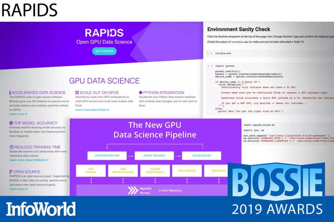 RAPIDS 能够利用内存内处理方式在 GPU 上直接训练机器学习模型,而且即使与其他 GPU 训练方法相比,其训练速度水平仍然要高出几个量级。它所使用的数据分析工具与 Python 相关实现方案完全等效(主要是 Pandas DataFrames)但又有所不同,在某些情况下你只需要变更脚本中的 import 语句即可完成兼容。