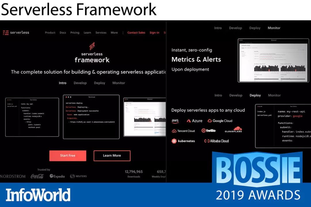 Serverless Framework 不仅允许用户自由选择不同的部署目标,同时也能帮助大家更快更轻松地对事件驱动型函数即服务应用程序进行测试、部署以及管理。在创建函数、定义端点并指定目标云环境之后,Serverless Framework 即可对你的代码、安全性要求、资源要素以及云部署 YAML 进行打包,从而顺利完成项目部署。另外,该框架内置的自动检测功能也会立即开始监控并捕捉各项指标,从而提供开箱即用的通知功能。